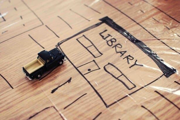 We added the essentials – a train station, a library, a grocery store, and our house. There are spots for the car to park and for the trains to rest. Plenty of winding roads and a few trees and flowers.
