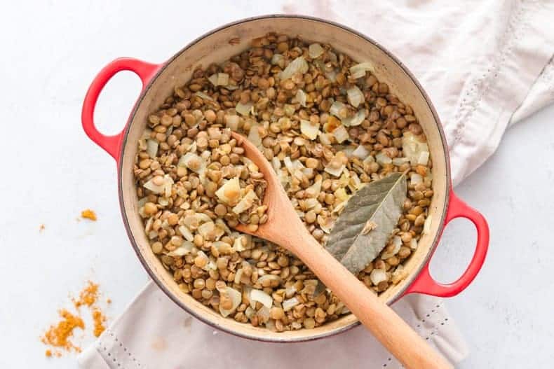 - Place broth, lentils, and bay leaves in a large pot and simmer on medium-high until broth is mostly gone and lentils are fully cooked. (15-20 minutes.)